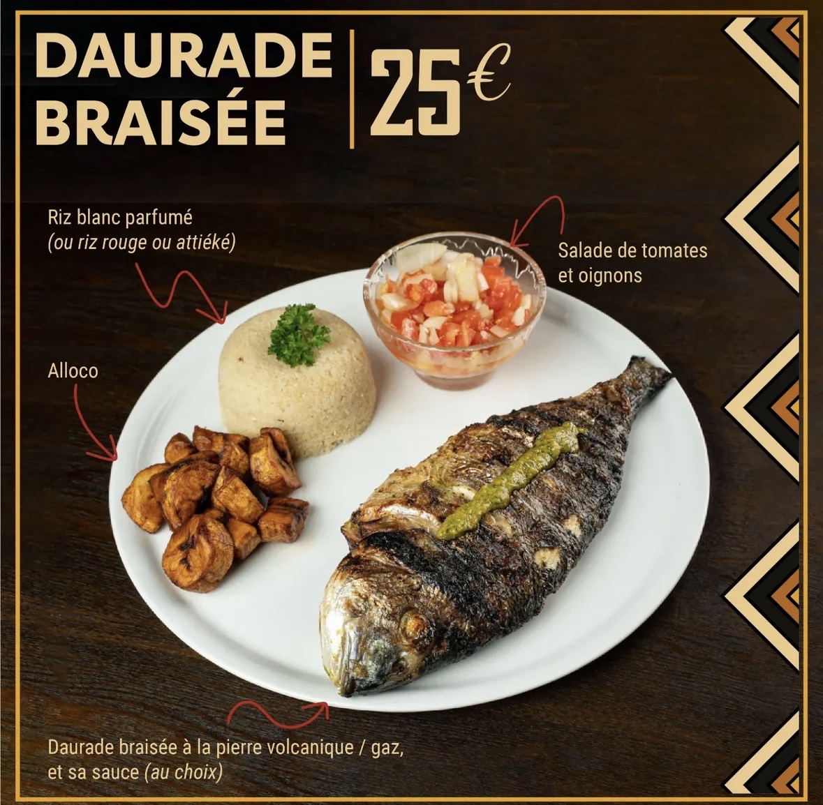 Daurade entière braisée à la pierre volcanique, peau croustillante et chair délicate. Servie avec attiéké (semoule de manioc), allocos dorés et sauce maison.