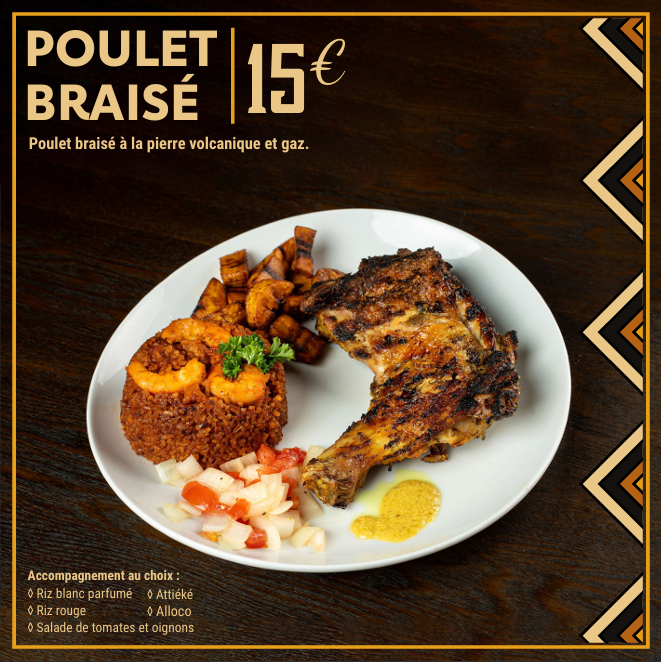 Poulet mariné et braisé lentement à la pierre volcanique pour une chair tendre et une peau fumée. Accompagné de riz, allocos caramélisés et sauce au choix.
